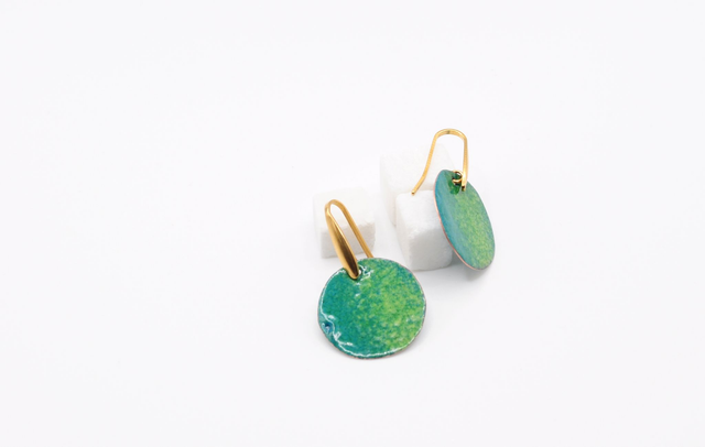 Ces boucles d'oreilles sont réalisées en cuivre émaillé, les montures pour oreilles percées sont en acier inoxydable doré. Elles mesurent 3,5 centimètres de haut et 2 centimètres de large et sont légères (environ 3,5 grammes la paire), ce qui les rend agréables à porter.