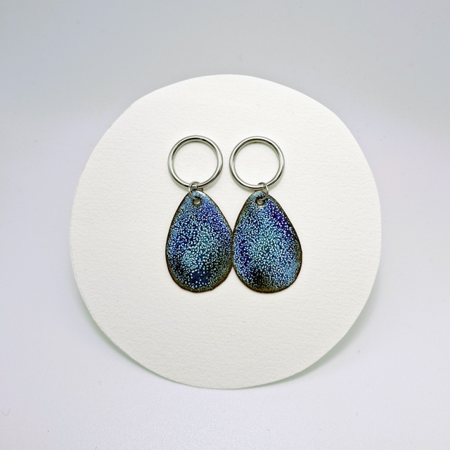 Ces boucles d'oreilles sont réalisées en cuivre émaillé, les montures pour oreilles percées sont en acier inoxydable doré. Elles mesurent 5 centimètres de haut et 2 centimètres de large et sont légères (environ 8 grammes la paire), ce qui les rend agréables à porter.